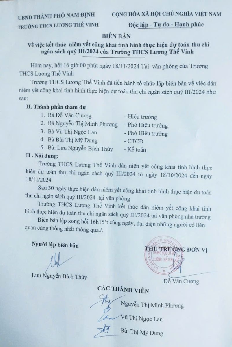 Biên bản về việc kết thúc niêm yết công khai tình hình thực hiện dự toán thu chi ngân sách quý III năm 2024