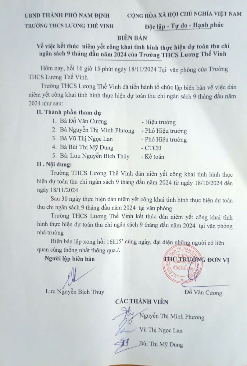Biên bản về việc kết thúc niêm yết công khai tình hình thực hiện dự toán thu chi ngân sách 9 tháng đầu năm 2024